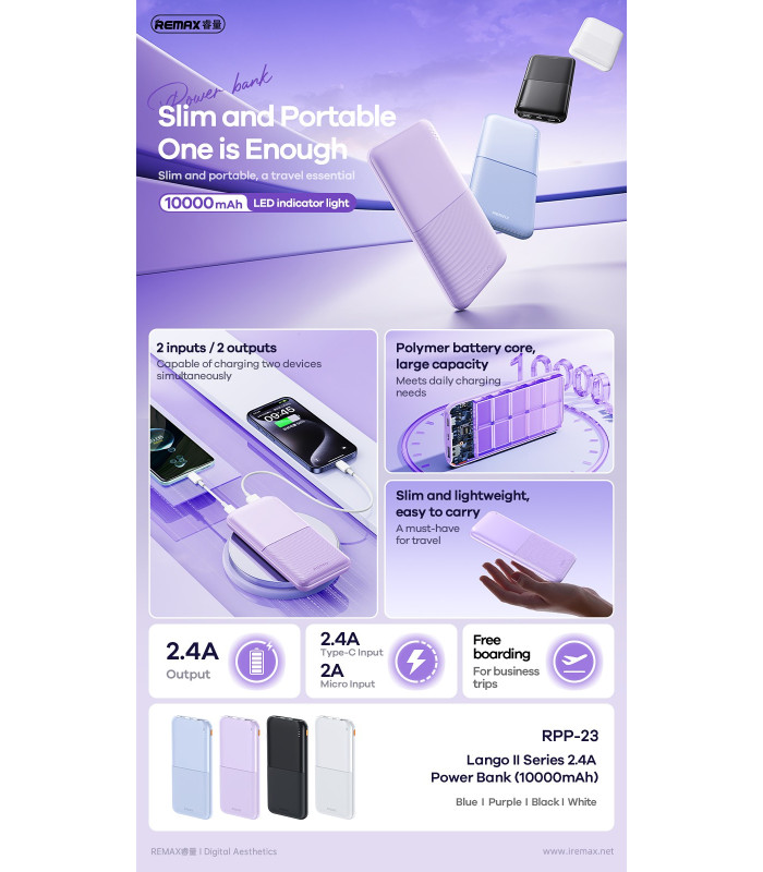 3. 2 inputs and 2 outputs, can charge 2 devices at the same time; LED indicator lights to show the power level clearly