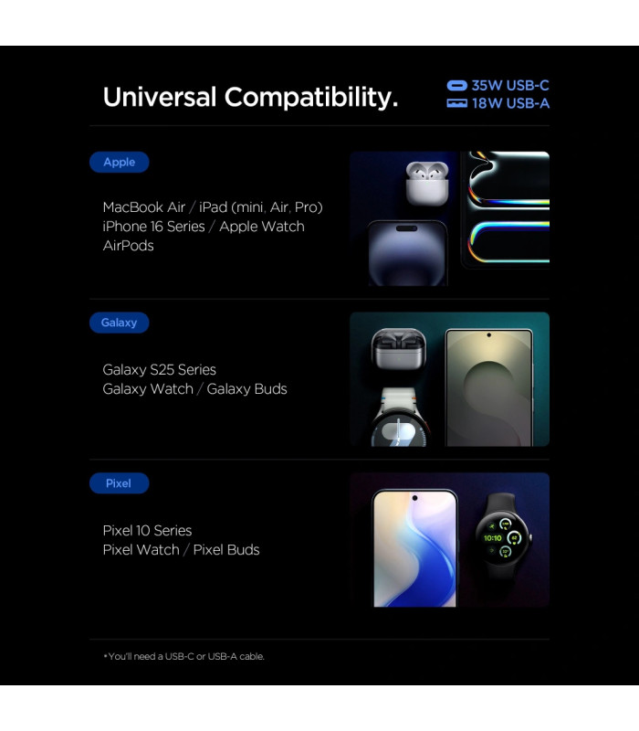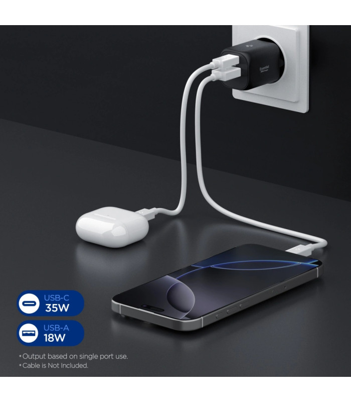 - Išvesties parametrai: USB-C 5 V / 3 A, 9 V / 3 A, 12 V / 2,92 A, 15 V / 2,33 A, 20 V / 1,75 A PPS 5 V - 11 V / 3 A, maks. 35 W