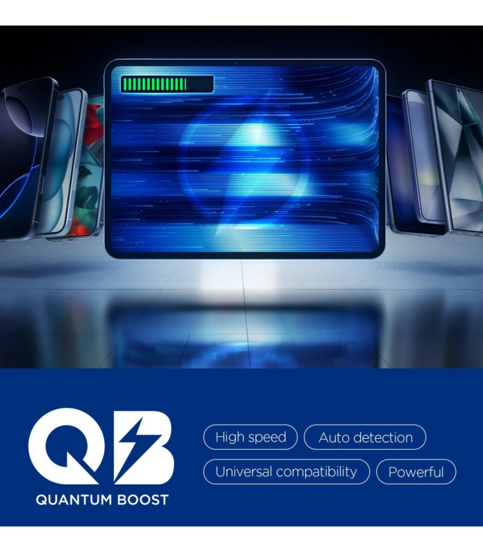 - Išvesties parametrai: USB-A 3,6–6,5 V / 3 A, 6,5–9 V / 2 A, 9–12 V / 1,5 A, maks. 19,5 W