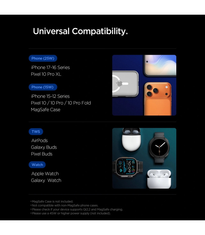 Įkroviklis visiškai suderinamas su išmaniaisiais telefonais, kuriuose įdiegta „MagSafe“ magnetinio įkrovimo technologija („iPhone 17-16“, „Pixel 10 Pro XL“ palaiko 25 W) ir su telefonais su magnetiniais dėklais arba „MagSafe“ lipdukais („iPhone 15-12“, „Pixel 10/10 Pro/10 Pro Fold“ palaiko 15 W).