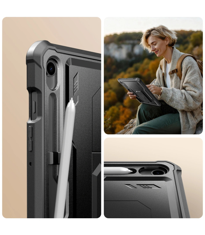 Dviejų dalių korpusas sujungia kietus galinius šarvus, pagamintus iš kompiuterio korpuso ir smūgiams atsparaus TPU. Papildomas sutvirtinimas kampuose – apsauginės oro pagalvės – efektyviai sugeria bet kokį kritimą. Prietaiso priekį supa rėmas su integruota polikarbonato plėvelė. Šis sprendimas puikiai atskiria ekraną, apsaugodamas jį nuo subraižymo.